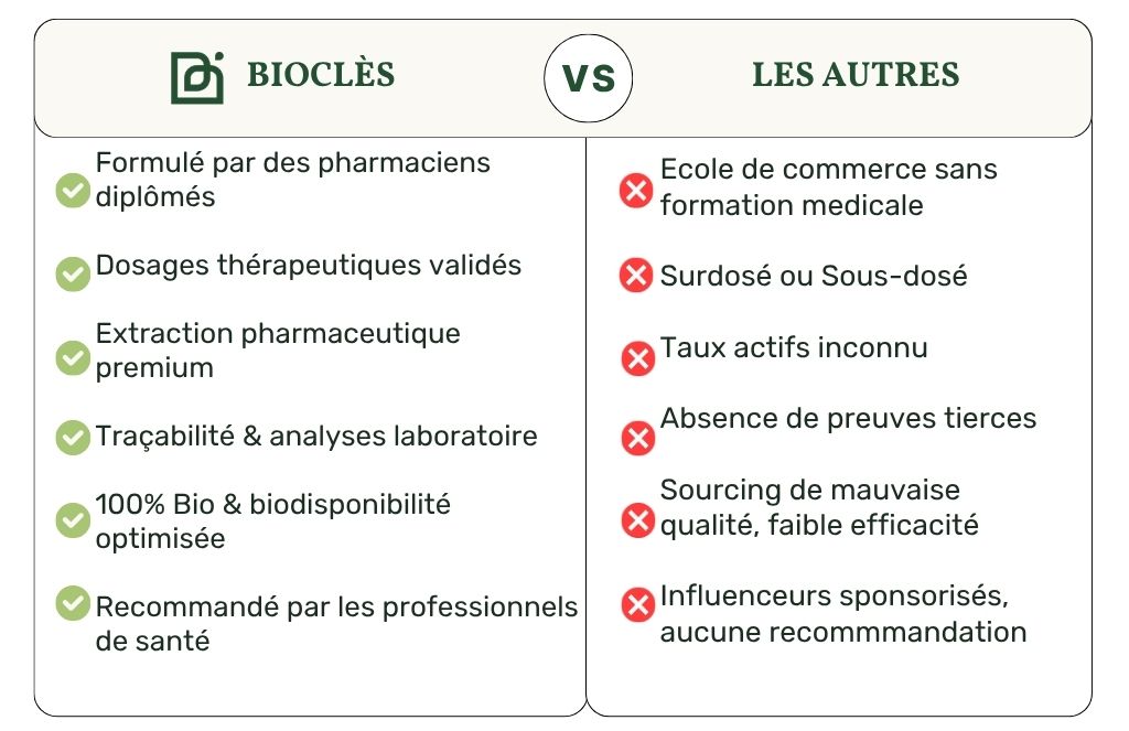 Parce que la qualité a un coût. Nos extraits 20:1 coûtent 20 fois plus cher à produire que des poudres basiques. Ajoutez les contrôles laboratoire systématiques, la certification Bio, l’huile MCT pour l’absorption, et la fabrication française : vous obtenez un produit pharmaceutique, pas un complément marketing sous-dosé. 1 gélule Biocles = 20 gélules de poudre standard en termes d’actifs.