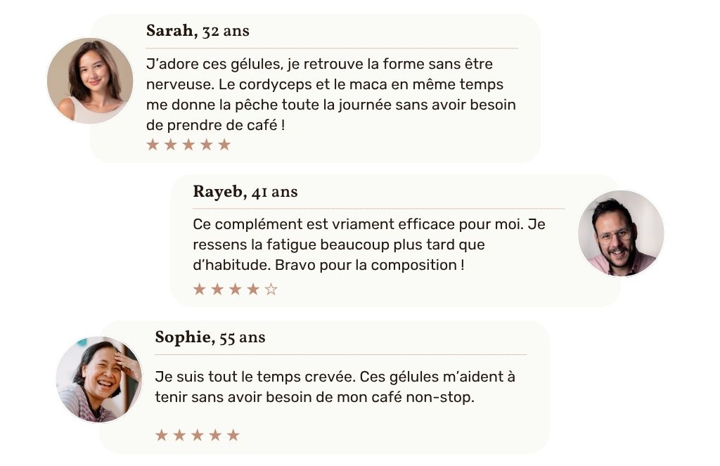 J’adore ces gelules, je retrouve la forme sans être nerveuse. Le cordyceps et maca en meme temps me donne la peche toute la journée sans le contre coup du café.