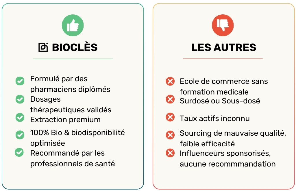 Parce que la qualité a un coût. Nos extraits 20:1 coûtent 20 fois plus cher à produire que des poudres basiques. Ajoutez les contrôles laboratoire systématiques, la certification Bio, l’huile MCT pour l’absorption, et la fabrication française : vous obtenez un produit pharmaceutique, pas un complément marketing sous-dosé. 1 gélule Biocles = 20 gélules de poudre standard en termes d’actifs.