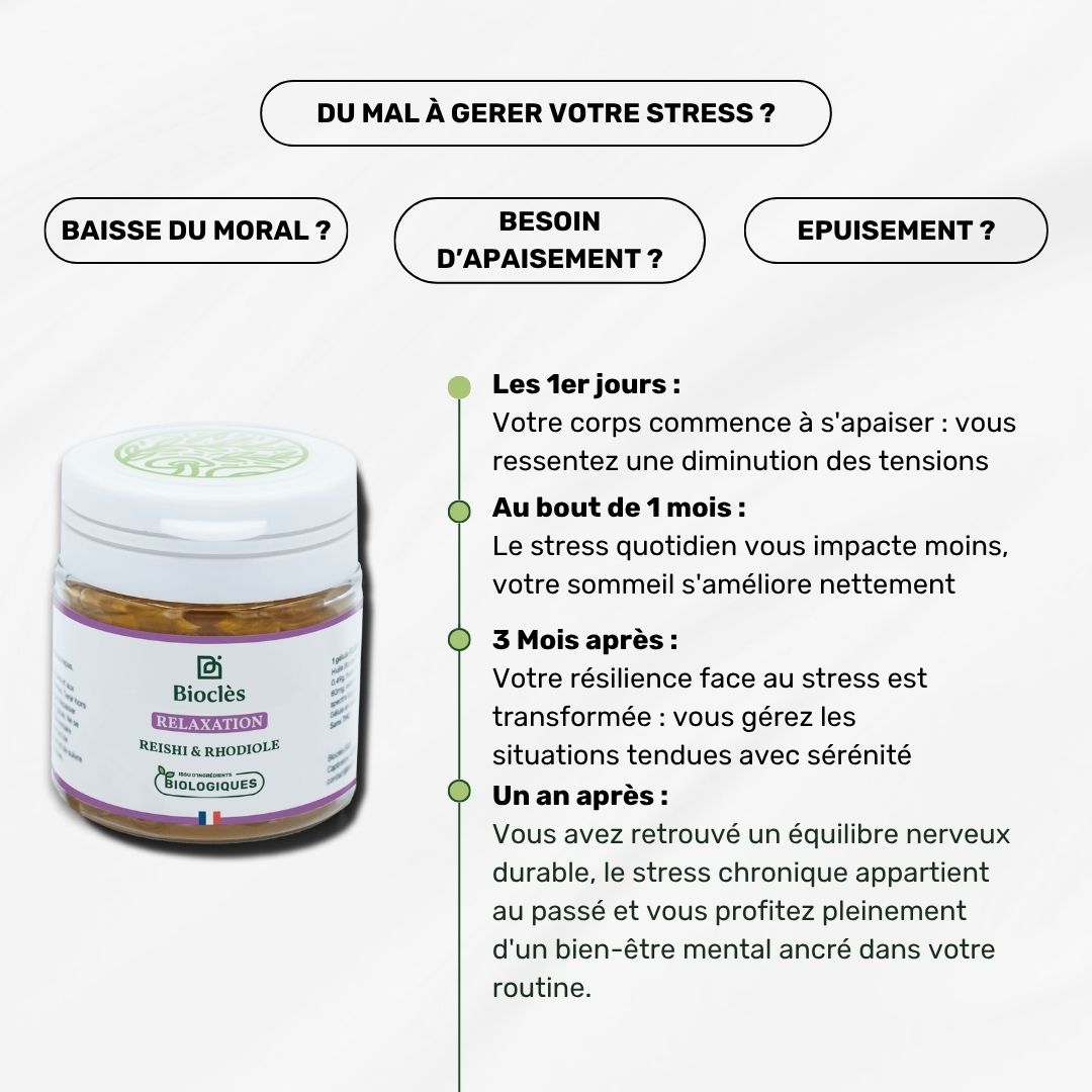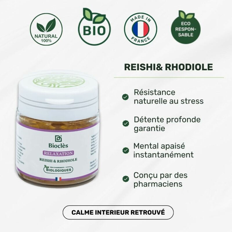 Ensemble, le Reishi et la Rhodiole forment une alliance puissante pour la relaxation. Ils soutiennent non seulement le corps dans sa gestion du stress, mais ils aident également à instaurer une sensation de sérénité, permettant ainsi de mieux profiter des moments de détente et d’apaiser l’esprit.