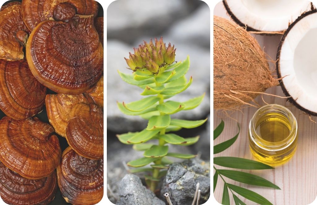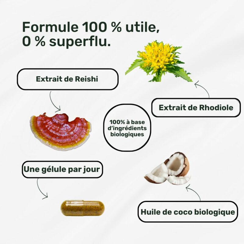 Extrait concentré de Reishi 13:1 = 180mg, Extrait concentré deRhodiole 5:1 = 180mg, Huile de noix de coco biologique MCT, Gélule en cellulose végétale.